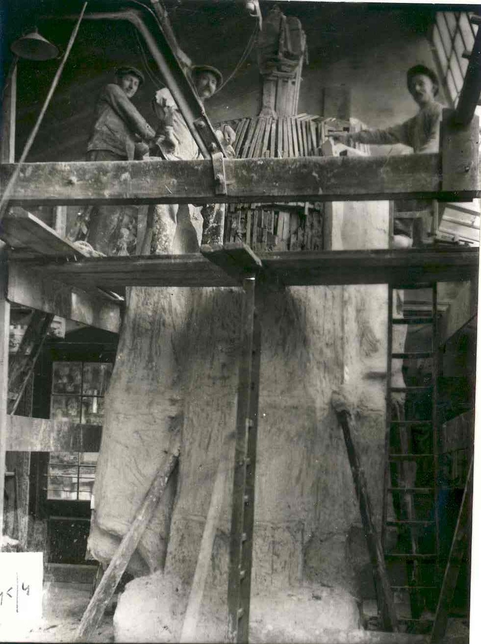 Foto -04 is een werkplaatsfoto met een groot beeld in een houten geraamte met boven langs een tweetal werklieden.