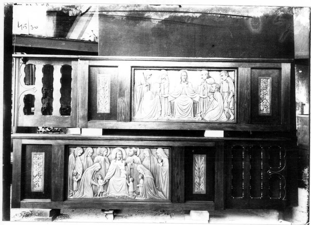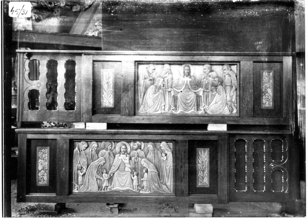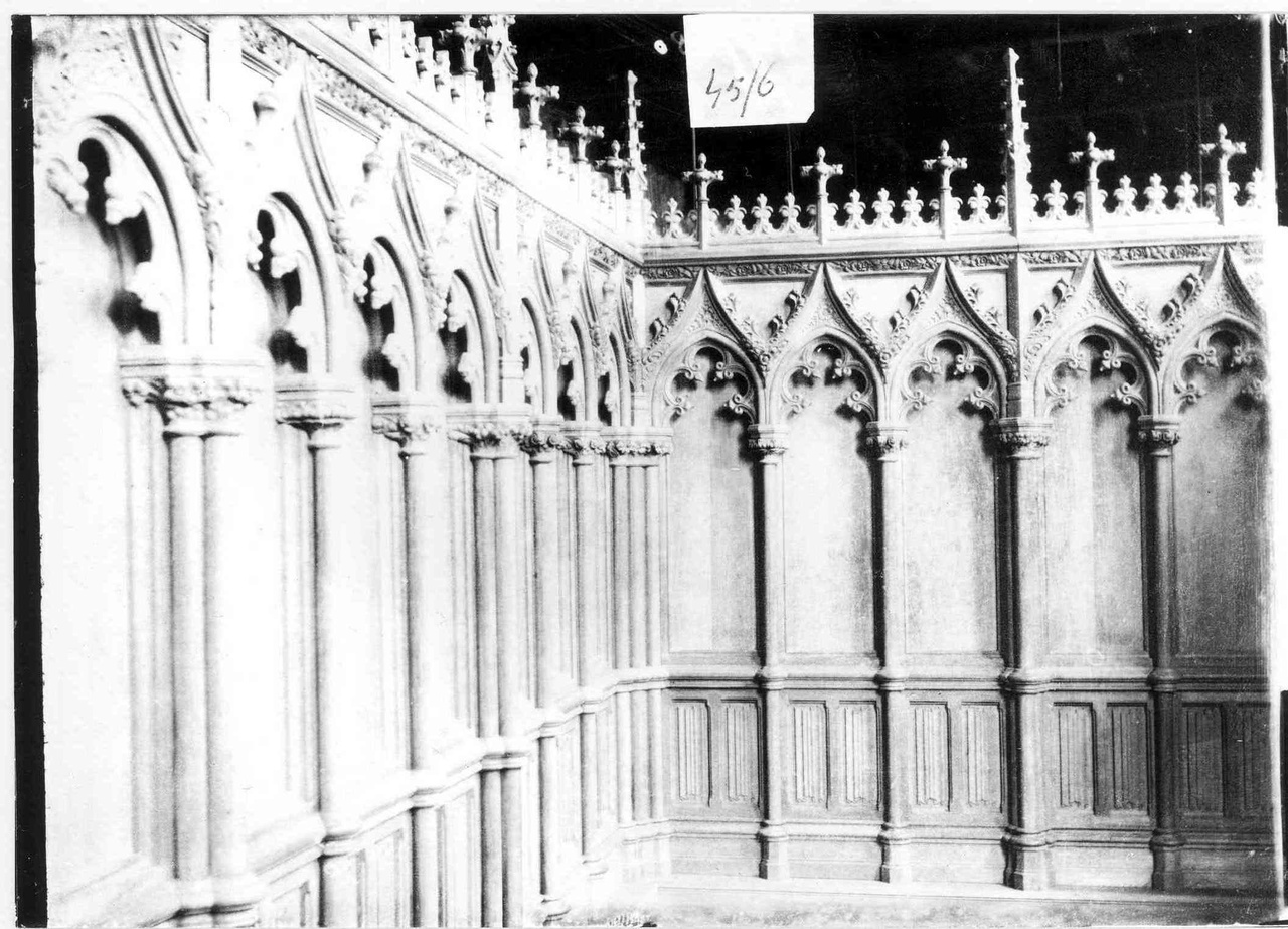 Afbeelding -06 is een foto van een fraai versierde lambrizering in een kerk.