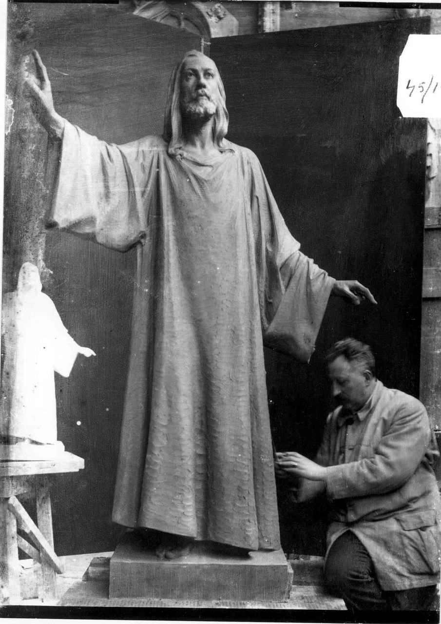 Op foto -09 staat een Christusbeeld met een medewerker van de werkplaats die het beeld aan het afwerken is.