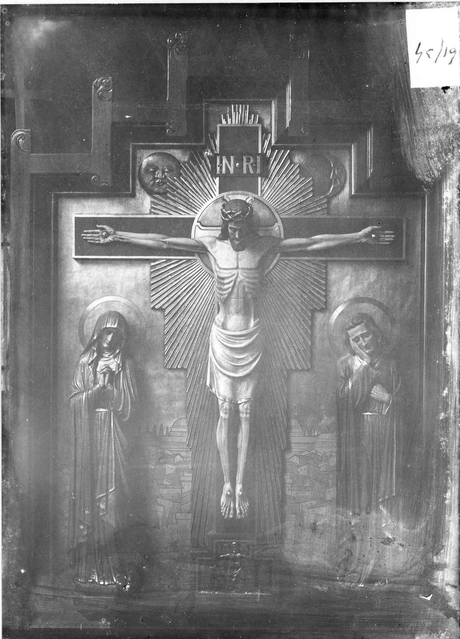 Op -22 en -23 staan twee houten reliëfs met in het midden Christus omringd door biddende personen.