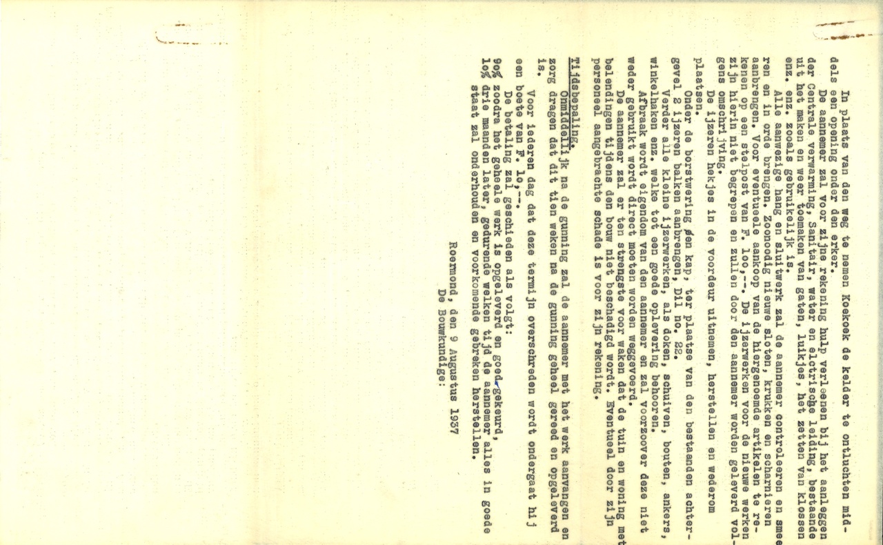 Verder bevat de map bouwtekeningen uit juli 1937, ondertekend door de architect H. Huisintveld en correspondentie hierover. Ook een nota van de firma Huygen & Wessel N.V. betreffende de aan te leggen centrale verwarming behoort tot de inhoud.