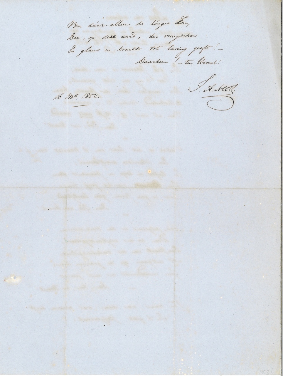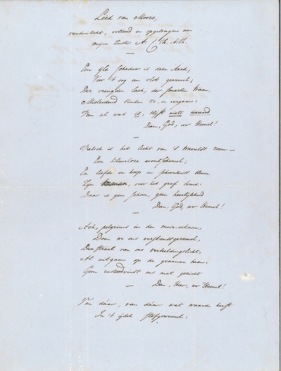 Verduitscht, voltooid en opgedragen aan mijne zuster A.. door Th. A. Th. Op blauwgekleurd papier, gevouwen.
