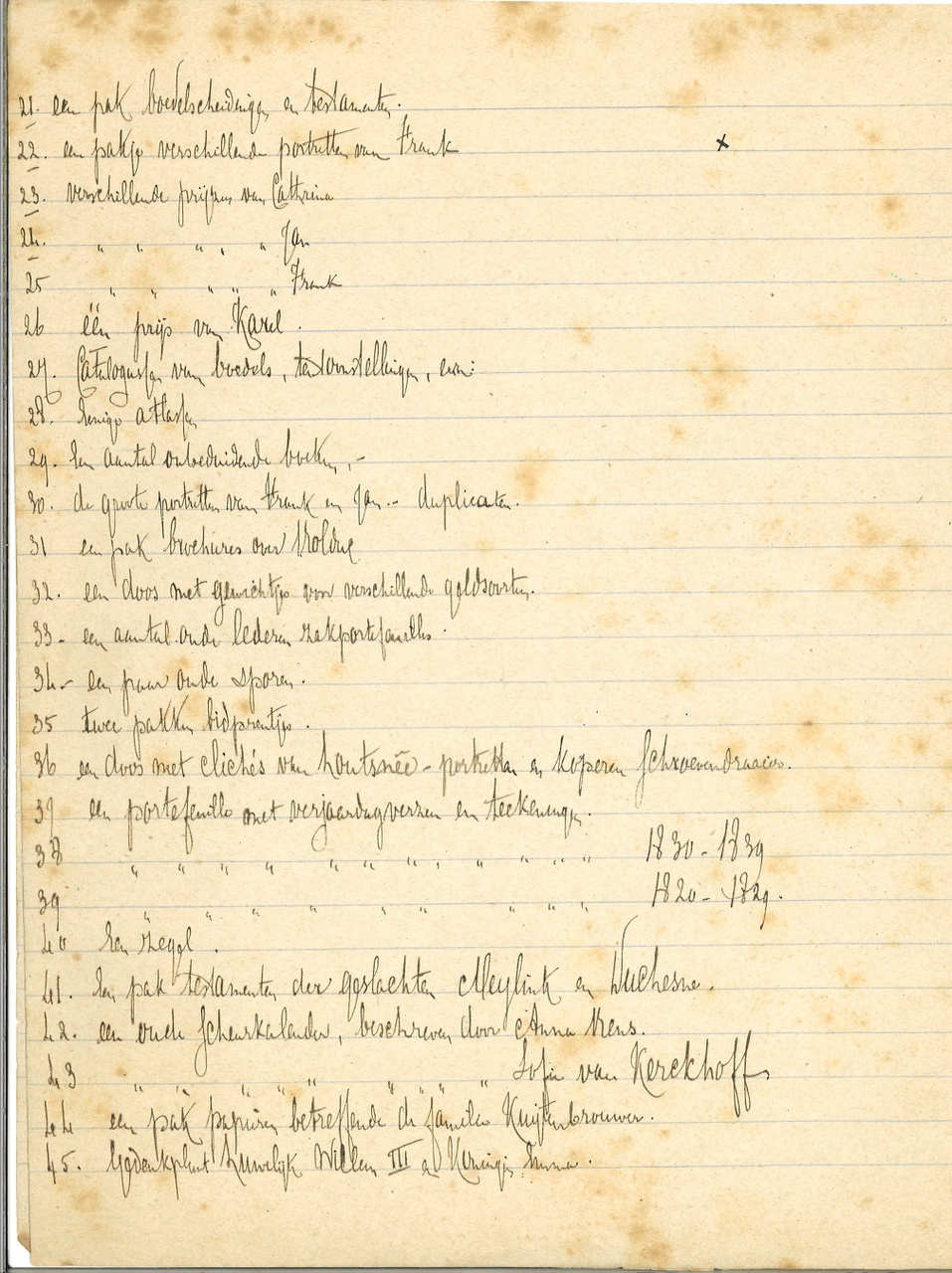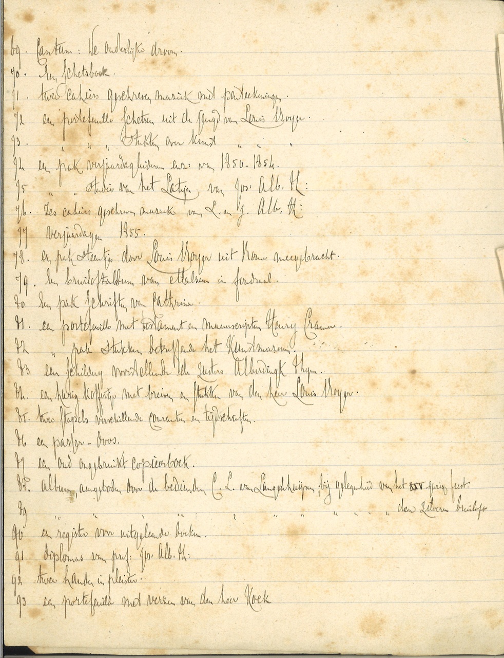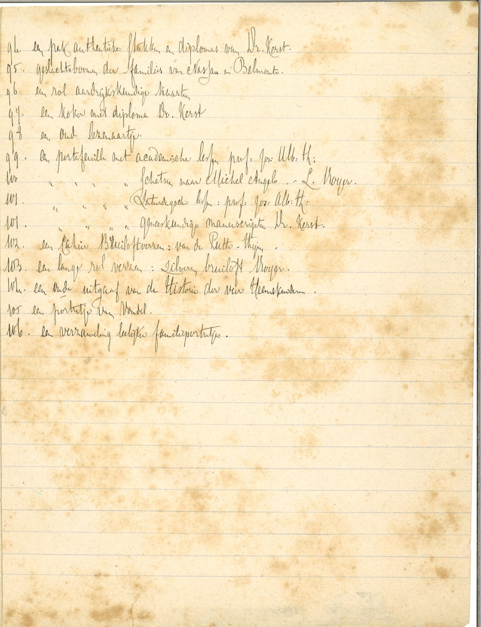 5 zijden beschreven, nrs. 1 t/m 106. Met 4 losse blaadjes met aantekenigen (1889-1890) en lijsten. Op gelinieerd papier.