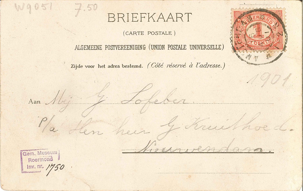 Afbeelding 1750-1 toont de vorozijde van de briefkaart en op de achterzijde staat de geadresseerde: Mej. G. Sofeber te Amsterdam. De briefkaart is gefrankeerd met een postzegel van 1 cent. Met potlood is het jaartal 1901 bijgeschreven.