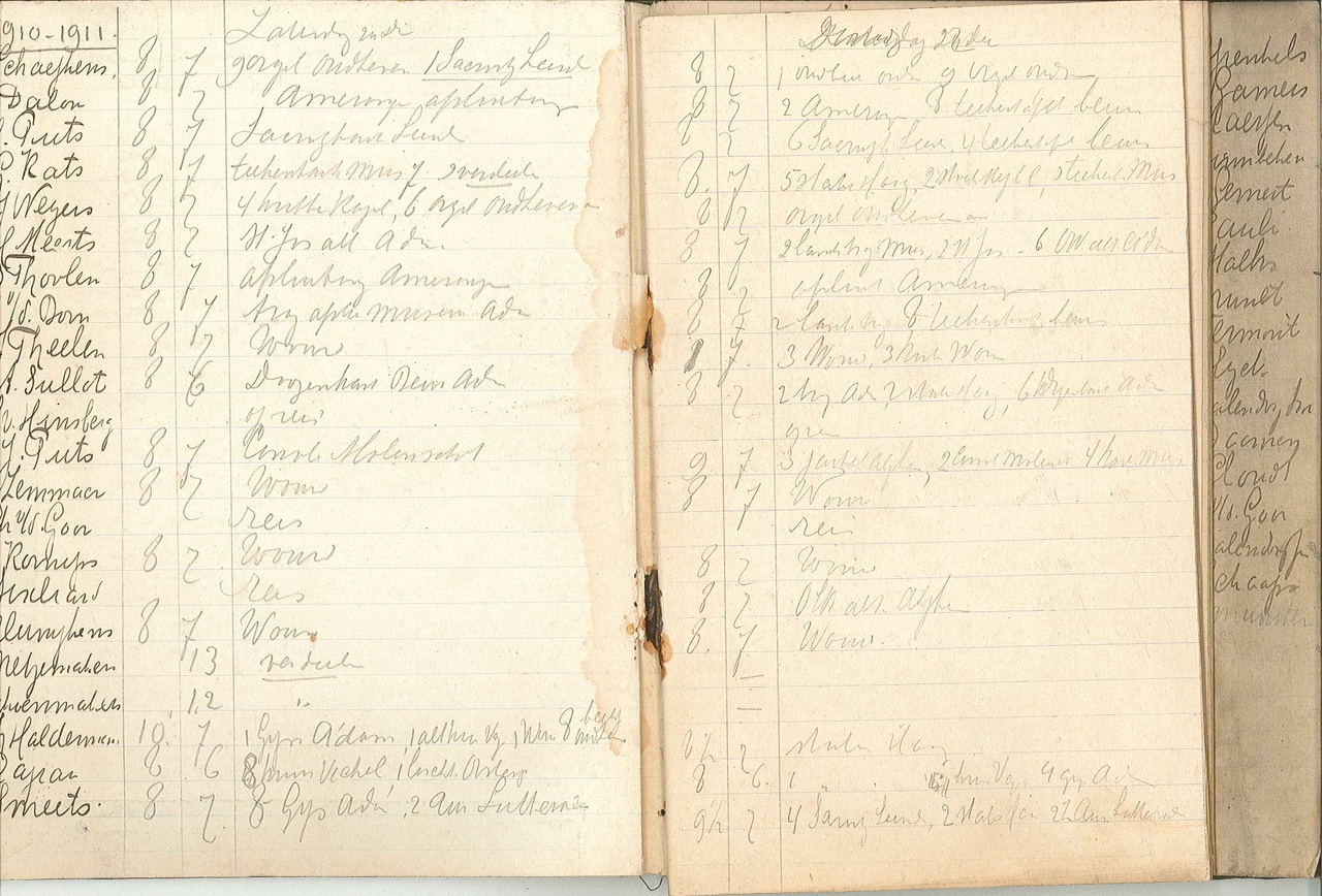 za. 24 december 1910 t/m za. 25 februari 1911. Per dag zijn de uren en werkzaamheden per werknemer genoteerd. Kaft: zwart-paars marmerpapier. Etiket waarop geschreven: Urenboekje Op de snede aan de bovenkant is geschreven: 1910 en 1911