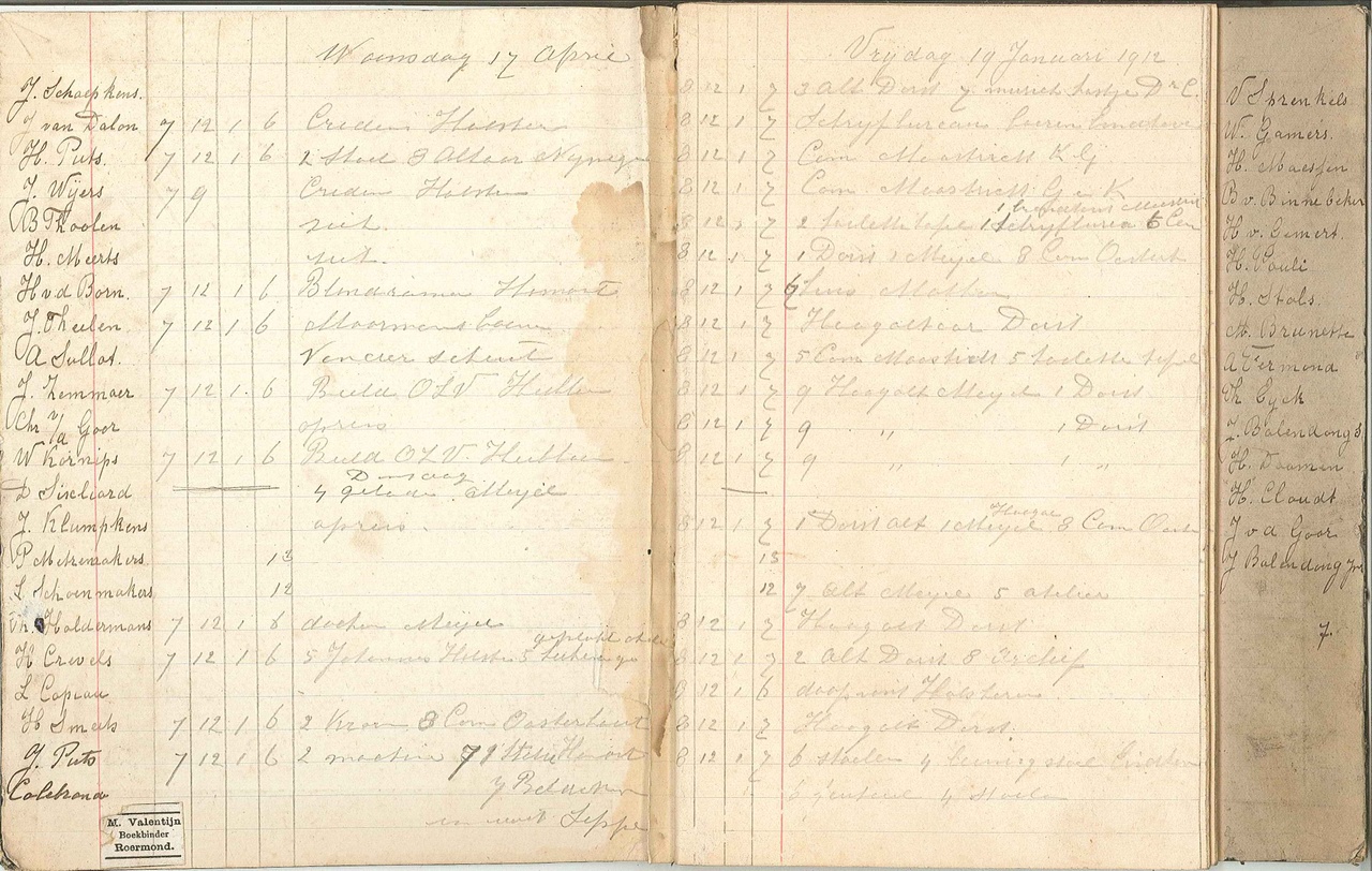 vr. 19 januari 1912 t/m do. 21 maart 1912. Per dag zijn de uren en werkzaamheden per werknemer genoteerd. Kaft: zwart-paars marmerpapier. Etiket waarop geschreven: Urenboekje 1912