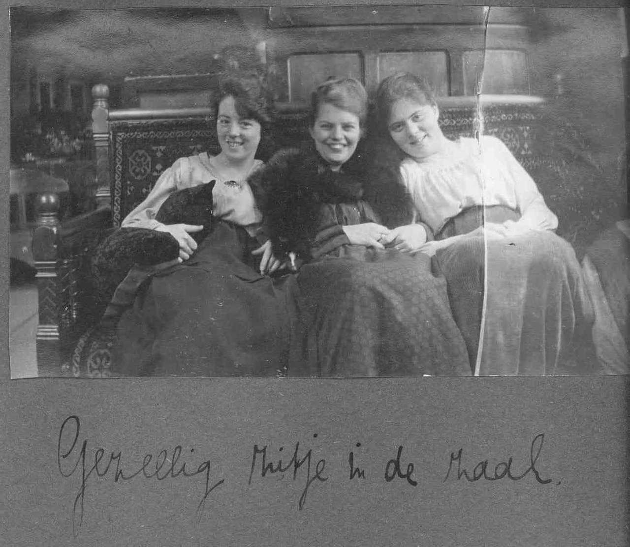 Groen rechthoekig fotoboekje, met groen touw gebonden. Op voorkant met zwart bedrukt: guirlande (in de vorm v.e. ovaal etiket). Diverse foto's met bijschriften, 1e: Ginneken, zomer 1915, laatste: Lekkum augustus 1921.