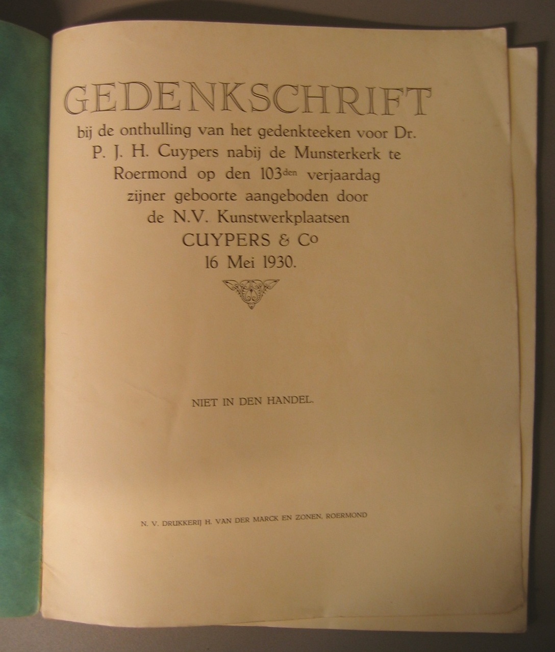Groen dun boekje met titel in sierlijke letters (goud/oranje) op voorpagina. Tekst titelblad: Gedenkschrift bij de onthulling van het gedenkteken voor Dr. P.J.H. Cuypers nabij de Munsterkerk op den 103den verjaardag zijner geboorte aangeboden door de N.V. Kunstwerkplaatsen Cuypers & Co 16 mei 1930.
