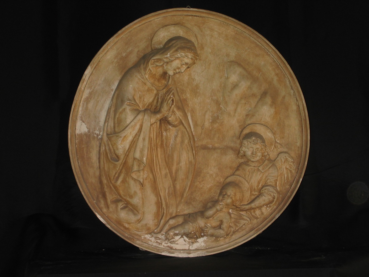 Een bas-reliëf met biddende Maria en pasgeboren Jezus. Maria draagt een mantel en eronder draagt zij een loshangend gewaad. Op het hoofd heeft zij een hoofddoek. Onder de hoofddoek zijn de haren te zien. Achter op het hoofd heeft zij een nimbus. Biddende Maria kijkt naar Jezus. Die ligt op de linkerzijde. Hij kijkt naar Maria. Jezus houdt zijn rechter hand bij het gezicht. De engel zit achter Jezus. De engel houdt het hoofd van liggende Jezus vast. De engel draagt een loshandend gewaad, heeft vleugels, korte krullende haren en een nimbus achter op het hoofd. Op de achtergrond van het beeld zijn de bergen afgebeeld. Het reliëf is omkranst. De achterkant is niet afgewerkt.