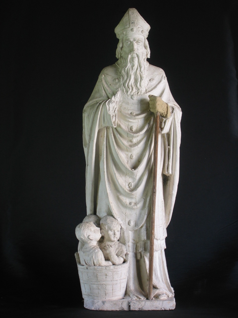 St. Niklaas draagt een kazuifel en een mijter. De onderkleding is met franje afgewerkt. Het beeld heeft lange baard en kijkt rechtvooruit. De rechterhand van het beeld is afgebroken. De linkerhand is van geel materiaal gemaakt. In de linker hand houdt St. Niklaas een staf vast. De staf is van het hout gemaakt. Bij de voeten van St. Niklaas staat een vat met drie kinderen erin. Eén van de kinderen kijkt naar St. Niklaas. Het beeld staat op een gipssokkel. De achterkant van het beeld is hol en niet afgewerkt. De mijter is op de achterkant afgewerkt.*