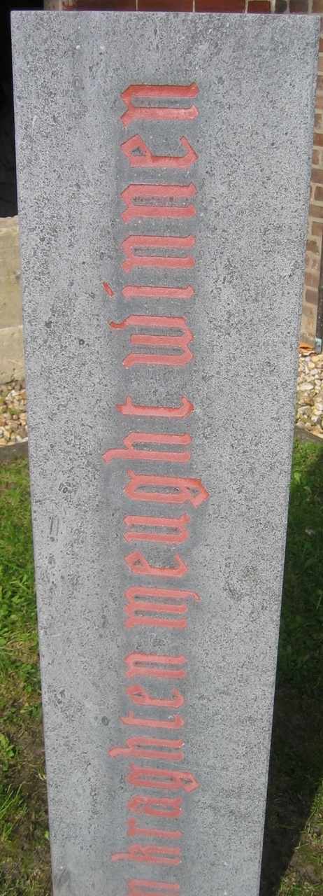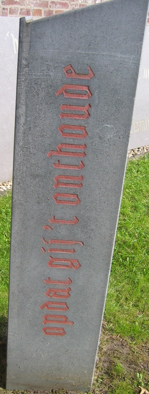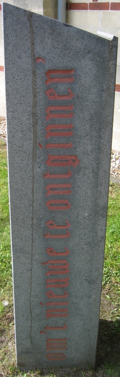 Op de hardstenen lessenaar staat de tekst: "Studeert op 't oude, Opdat gij 't onthoude, En kraghten meught winnen Om 't nieuwe te ontginnen."