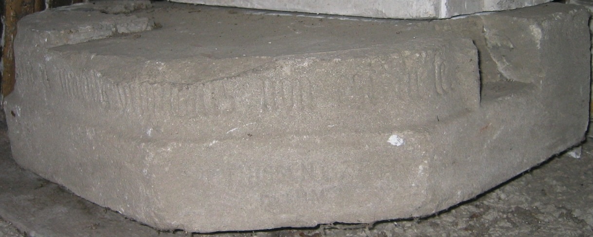 Het voetstuk in de vorm van een halve zeshoek bevat een latijnse tekst die moeilijk leesbaar is: "......... es Maria et malnia(?) ...gmans non est in te" Onder de latijnse tekst staat: J. Thissen en zonen 1907