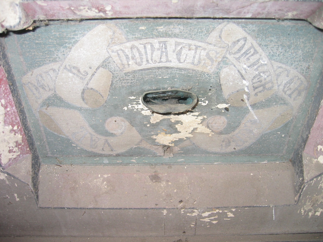 Op het basement bevindt zich een "lijst" met krulmotieven. Daarop het offerblok. In het midden onder bevindt zich een afsluitbare klep met gleuf. Op een groene achtergrond staat in zilveren banieren een tekst, die als men rechtsboven beginnend met de klok mee leest, als volgt luidt: "Offer ter eere van den H. Donatus" (zie afb. 5039-2)