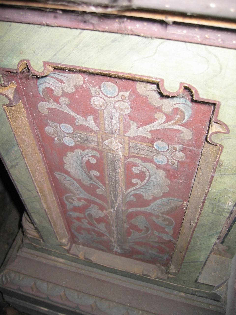 Beide zijkanten zijn ook gepolychromeerd en bevatten de afbeelding van een zilveren kruis op een rode achtergrond. Om het kruis heen zijn bladmotieven geslingerd (zie afbeelding 5040-2).