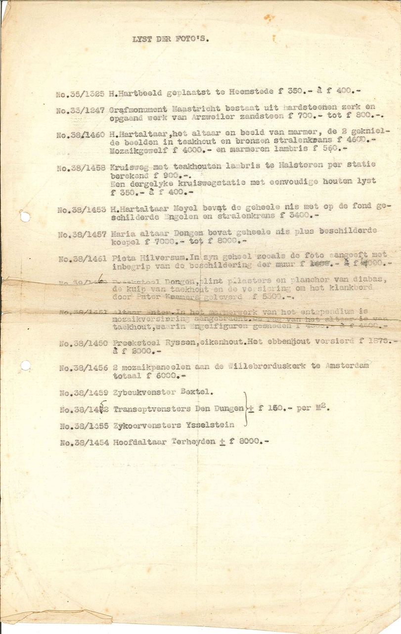 Op de lijstjes staan met nummer en prijs foto's van werkstukken vermeld, die door Cuypers' Werkplaatsen zijn vervaardigd met de vermelding van de standplaats in het land.