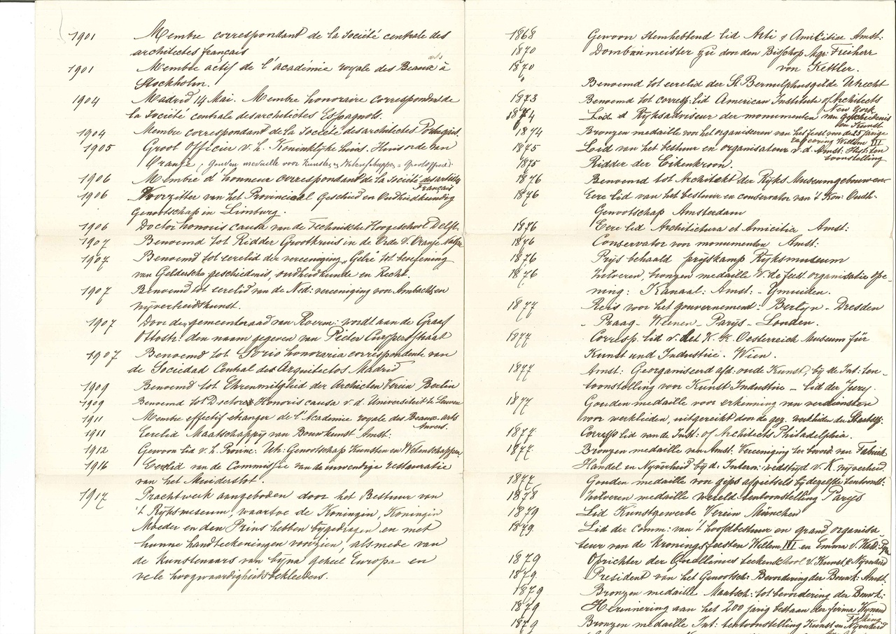 Lijst met een opsomming van alle decoraties, benoemingen en medailles van Dr. P.J. H. Cuypers.