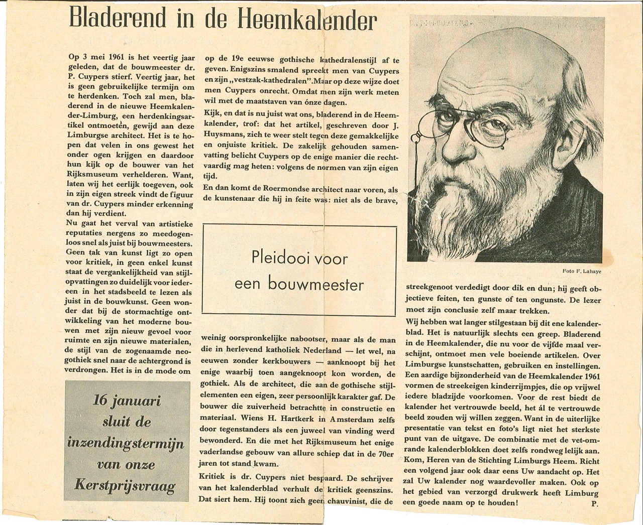 Een artikel in het tijdschrift "Credo" van 13 januari 1961 over een kalenderpagina geschreven door J. Huysmans in de "Heemkalender" over dr. Cuypers.