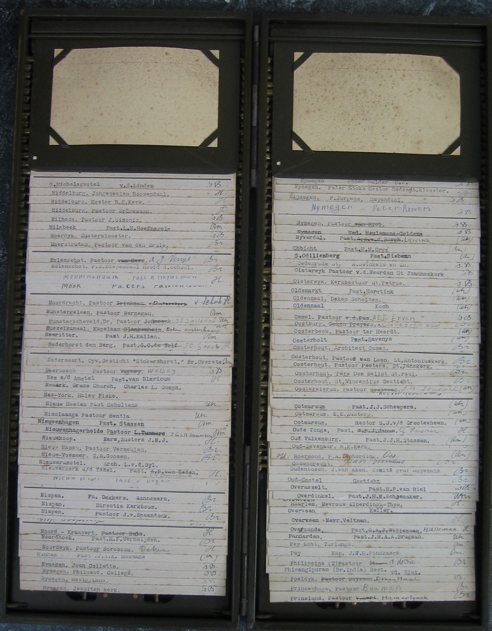 De dubbele kaartenbak bevat ca. 90 klantenkaartjes (van 9,5 x 15 cm) gerangschikt op woonplaats, waarin precies omschreven staat welk product of welke dienst geleverd is met datum. In deze bak met opschrift Mi - P. alle adressen tussen St. Michielsgestel en Prinsland.