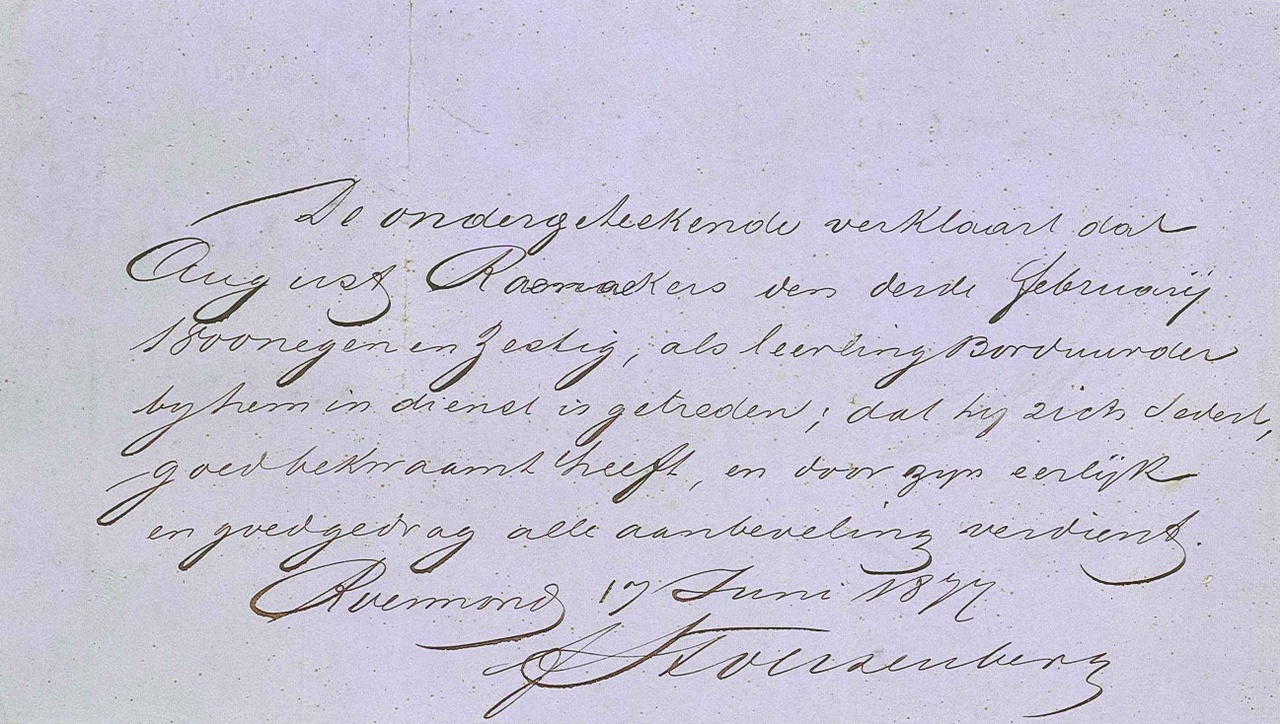Voorin het tekenboek staat een met de hand geschreven aanbeveling van Frans Stoltzenberg jr. (1838-1909), fabrikant van liturgisch textiel en compagnon van architect Pierre Cuypers (1827-1921), die als volgt luidt: ‘De ondergeteekende verklaart dat August Raemaekers den derde februarij 1800 negenenzestig, als leerling borduurder bij hem in dienst is getreden; dat hij zich sedert, goed bekwaamt heeft, en door zijn eerlijk en goed gedrag alle aanbeveling verdient.