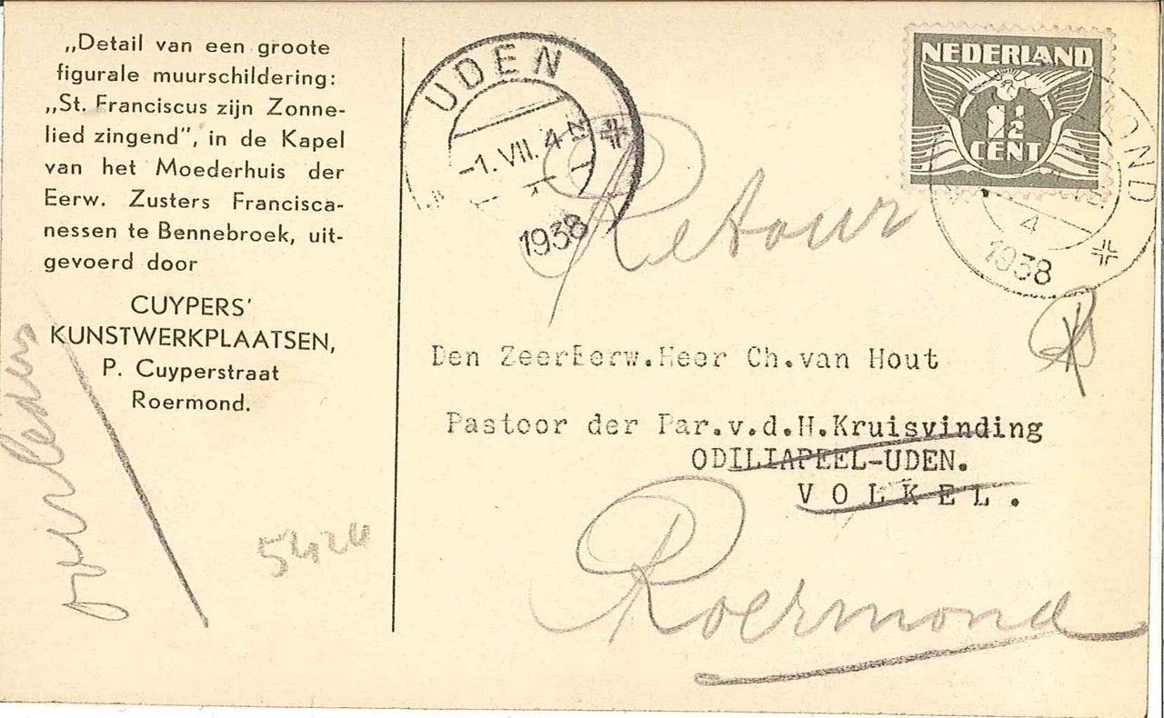 De foto's zijn als briefkaart uitgevoerd. Zij dienden als reclame-object voor Cuypers' Kunstwerkplaatsen. Op de achterzijde staat gedrukt: "Detail van een groote figurale muurschildering: "St. Franciscus zijn Zonnelied zingend", in de Kapel van het Moederhuis der Eerw. Zusters Franciscanessen te Bennebroek, uitgevoerd door: