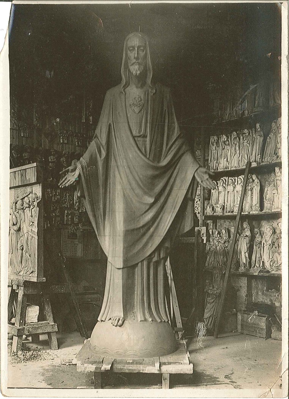 Foto van een werknemer in Cuypers' Werkplaatsen bezig met een H. Hartbeeld.
