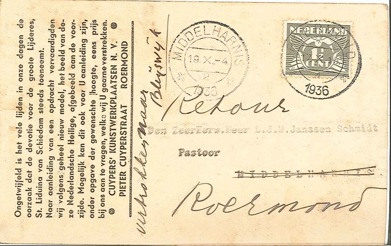 voorzijde: gedrukt: St. Liduinabeeld ontw. en uitgevoerd in fransche steen in Cuypers'Kunstwerkplaatsen Roermond