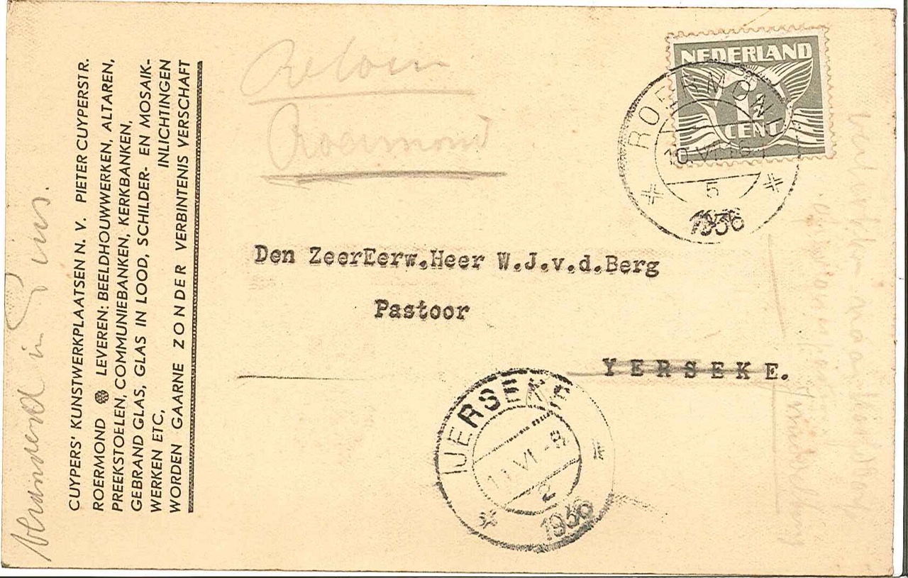 De foto is als briefkaart uitgevoerd. Zij diende als reclame-object voor Cuypers' Kunstwerkplaatsen. Op de achterzijde staat gedrukt: "Cuypers'Kunstwerplaatsen N.V. Pieter Cuyperstr. Roermond Leveren Beeldhouwwerken, Altaren, Preekstoelen, Communiebanken, Kerkbanken, Gebrand glas, Glas in lood, Schilder- en mosaikwerken etc.. Inlichtingen worden gaarne zonder verbintenis verschaft."