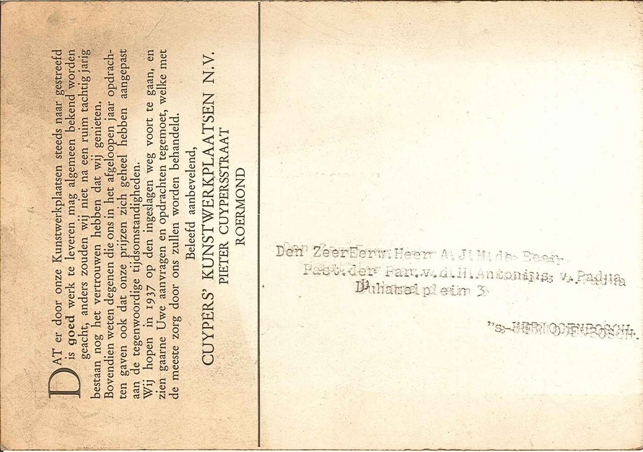 De foto is als briefkaart uitgevoerd. Zij diende als reclame-object voor Cuypers' Kunstwerkplaatsen. Op de achterzijde staat een uitgebreide reclametekst gedrukt. Er zijn twee kaarten aanwezig. Zie afbeeldingen 5437a en b.