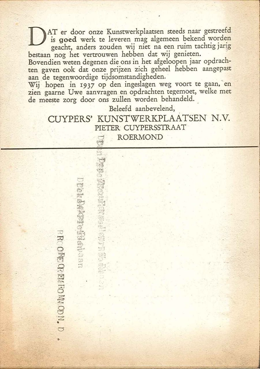 "Een Zalig Kerstfeest en Voorspoedig Nieuwjaar wordt U teogewenscht door Cuypers' Kunstwerkplaatsen."