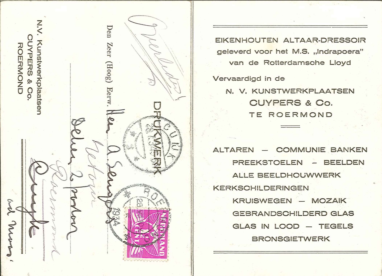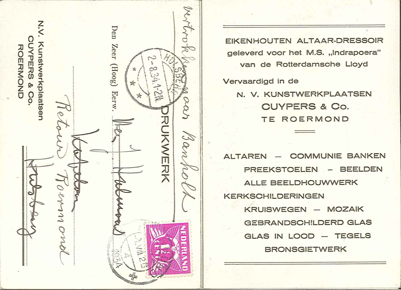 Op de achterzijde staat vermeld dat het eikenhouten altaar-dressoir geleverd was voor het M.S. "Indrapoera" van de Rotterdamsche Lloyd.