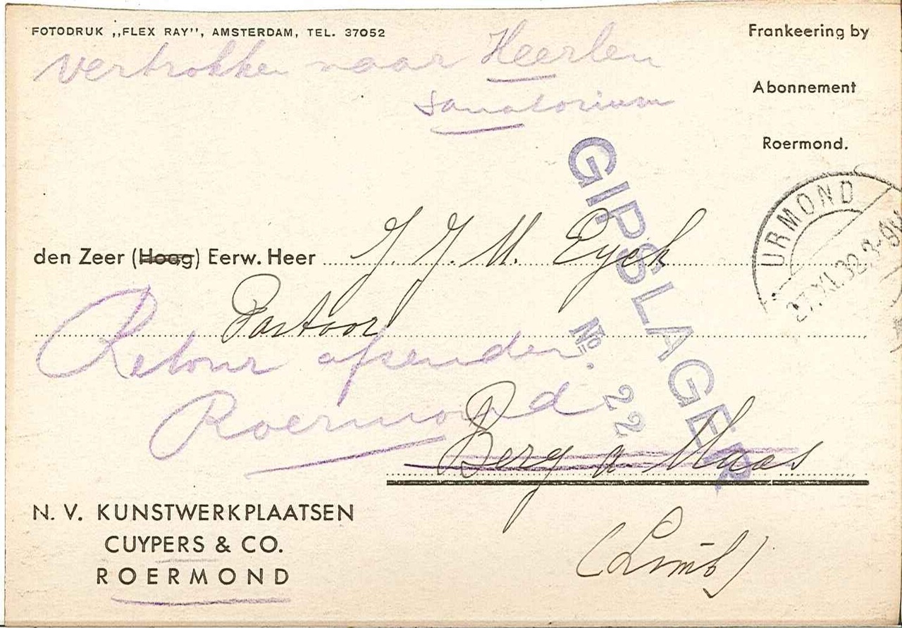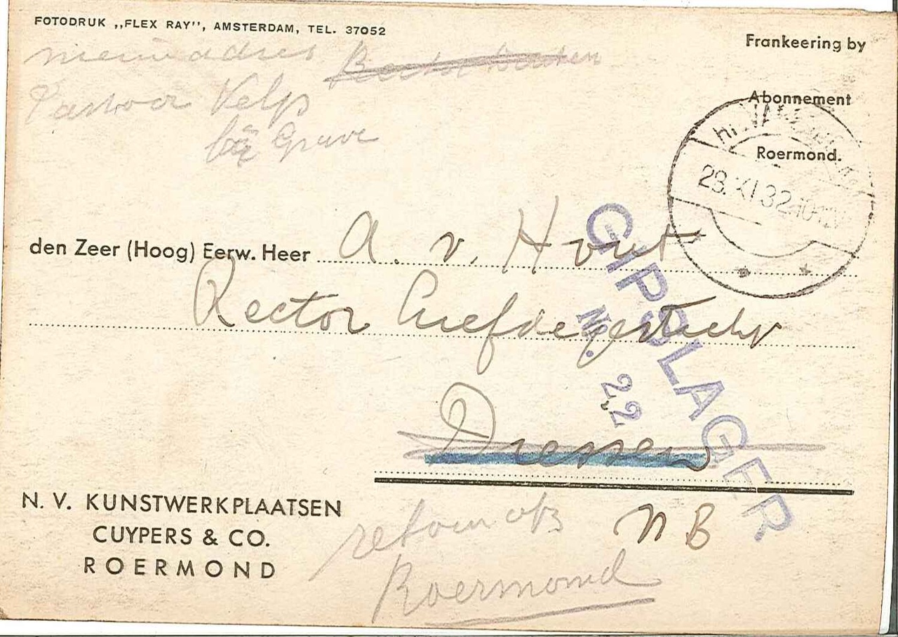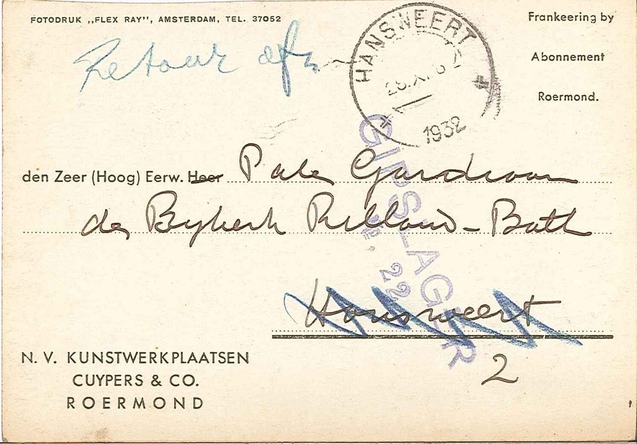 De ansichtkaarten zijn in november 1932 verstuurd naar diverse adressen, maar geretourneerd met opmerkingen als: "vertrokken, ander adres, overleden, etc."