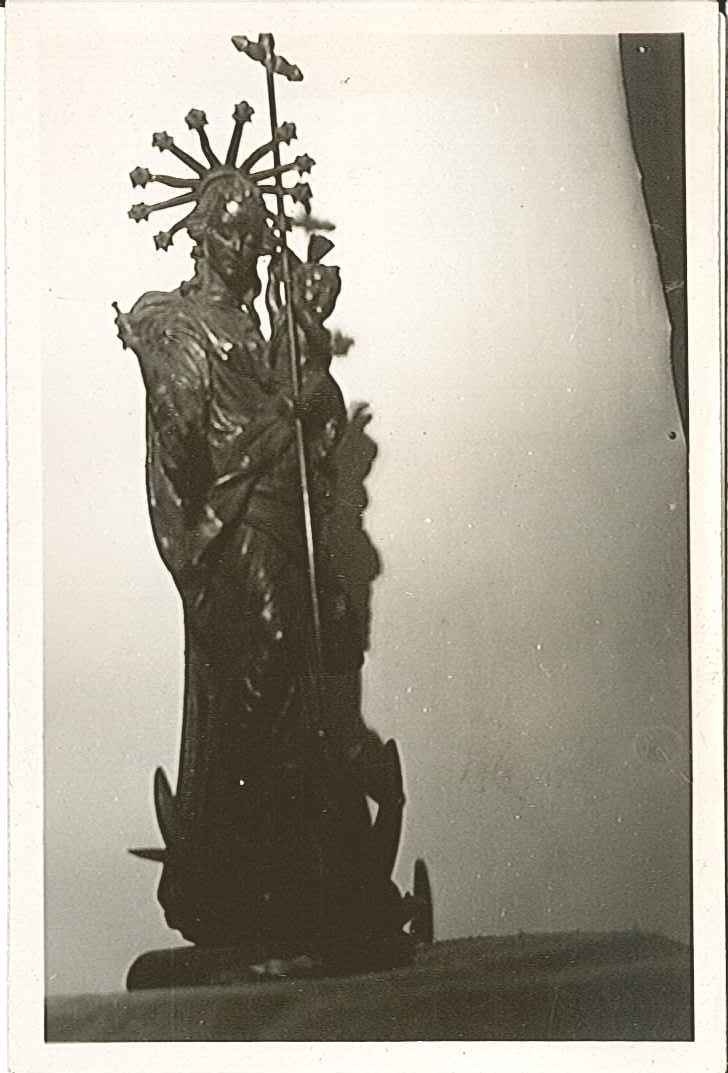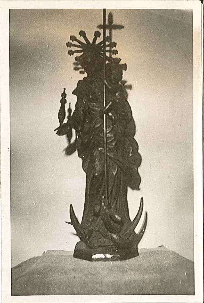 Op de foto's staat het beeld vanuit drie posities gefotografeerd. Madonna met kind op de arm heeft een bloemenaureool en een staf of lans in de hand waarmee ze een slang doorboort. Ze staat op een maansikkel.