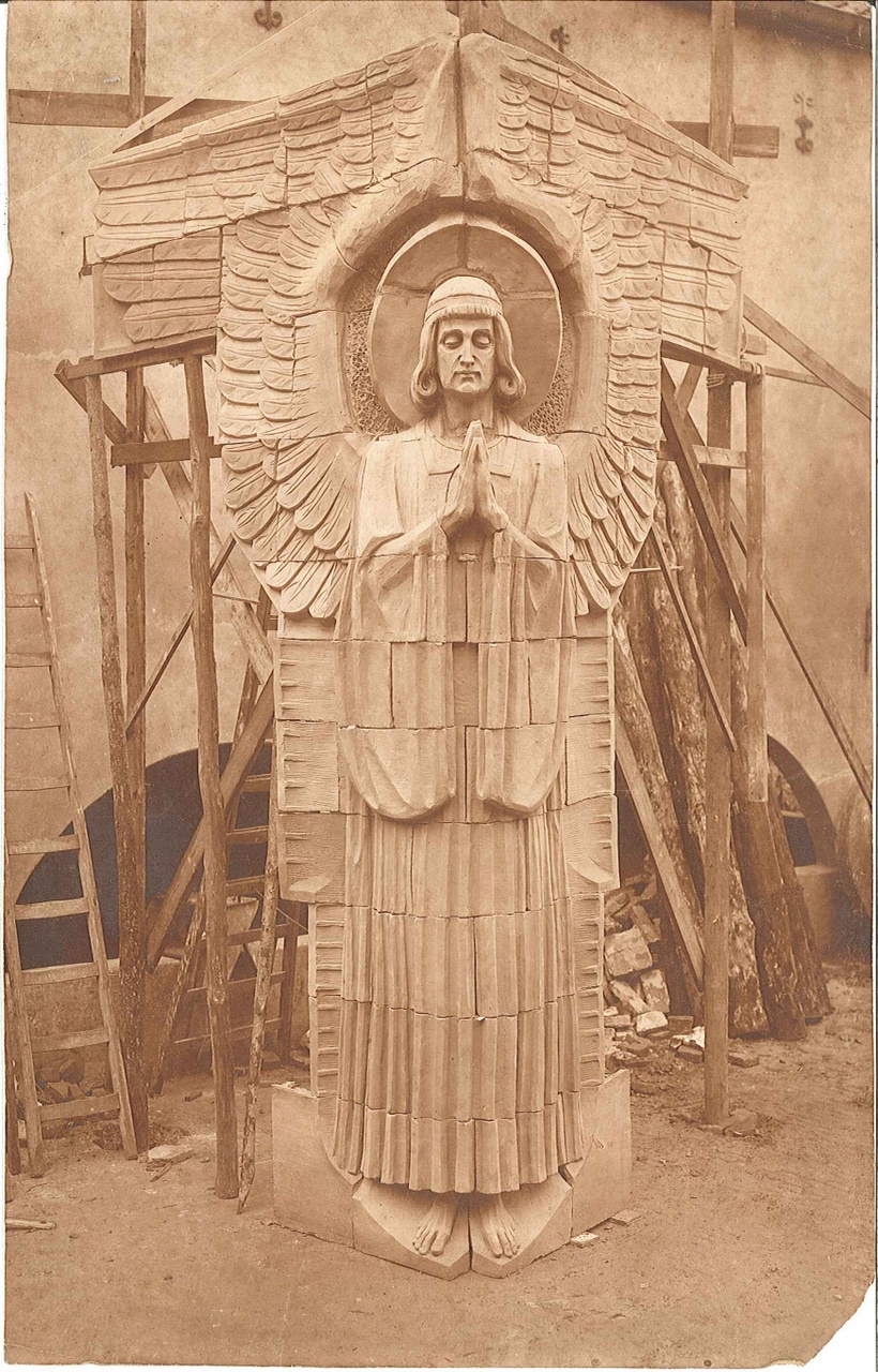 Op de foto's staat een engel met gevouwen handen. De engel is opgebouwd uit meerdere blokken steen (minstens 12). Gezien het feit dat er een ladder met minstens 15 treden op de achtergrond staat moet de engel toch zeker 4 meter hoog geweest zijn (grove schatting!).