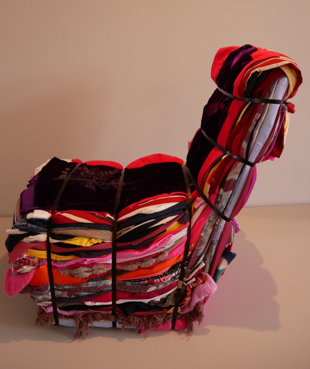 De stoel is samengesteld uit zeer veel lagen textiel, die bij elkaar worden gehouden met stalen banden.