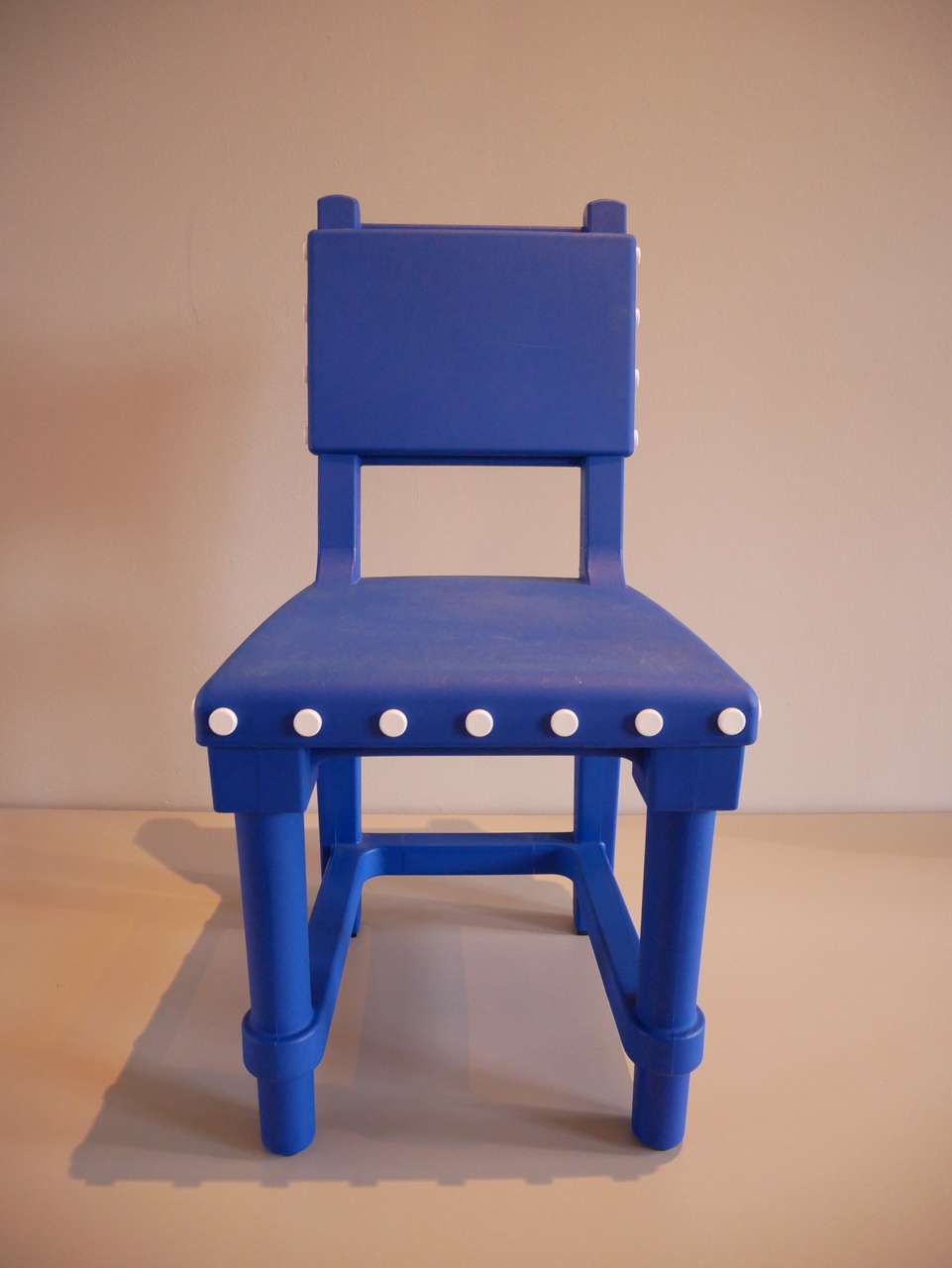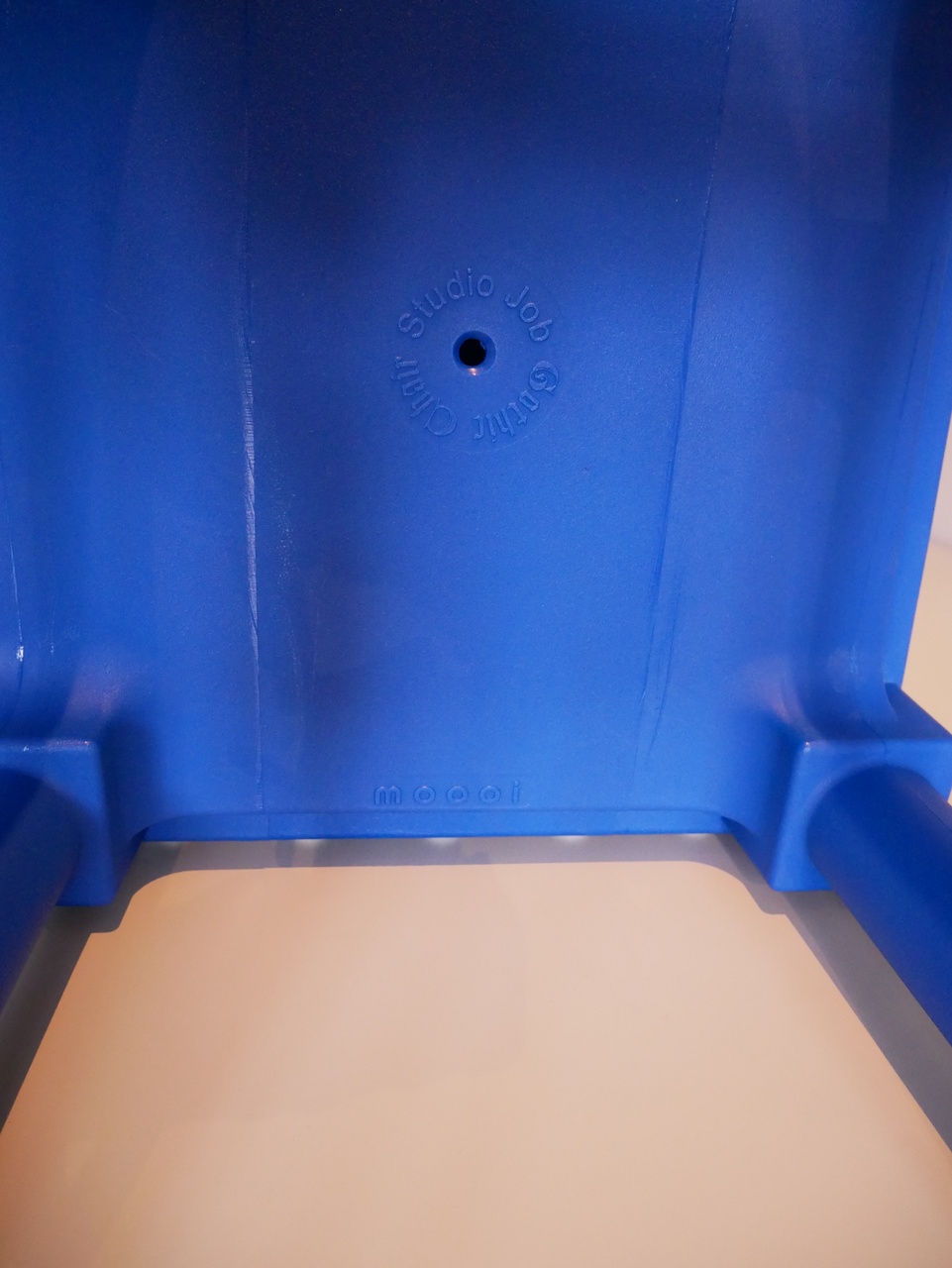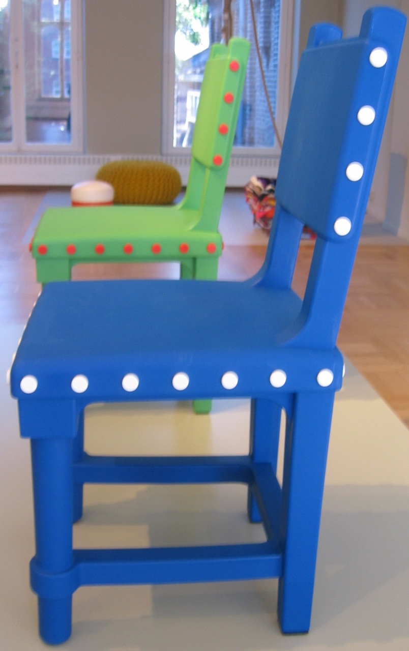Rechte (eetkamer)stoel, uitgevoerd in blauw met witte knoppen langs de zitting. De stoel is vervaardigd uit polyetheen, de knoppen zijn van abs-rubber.