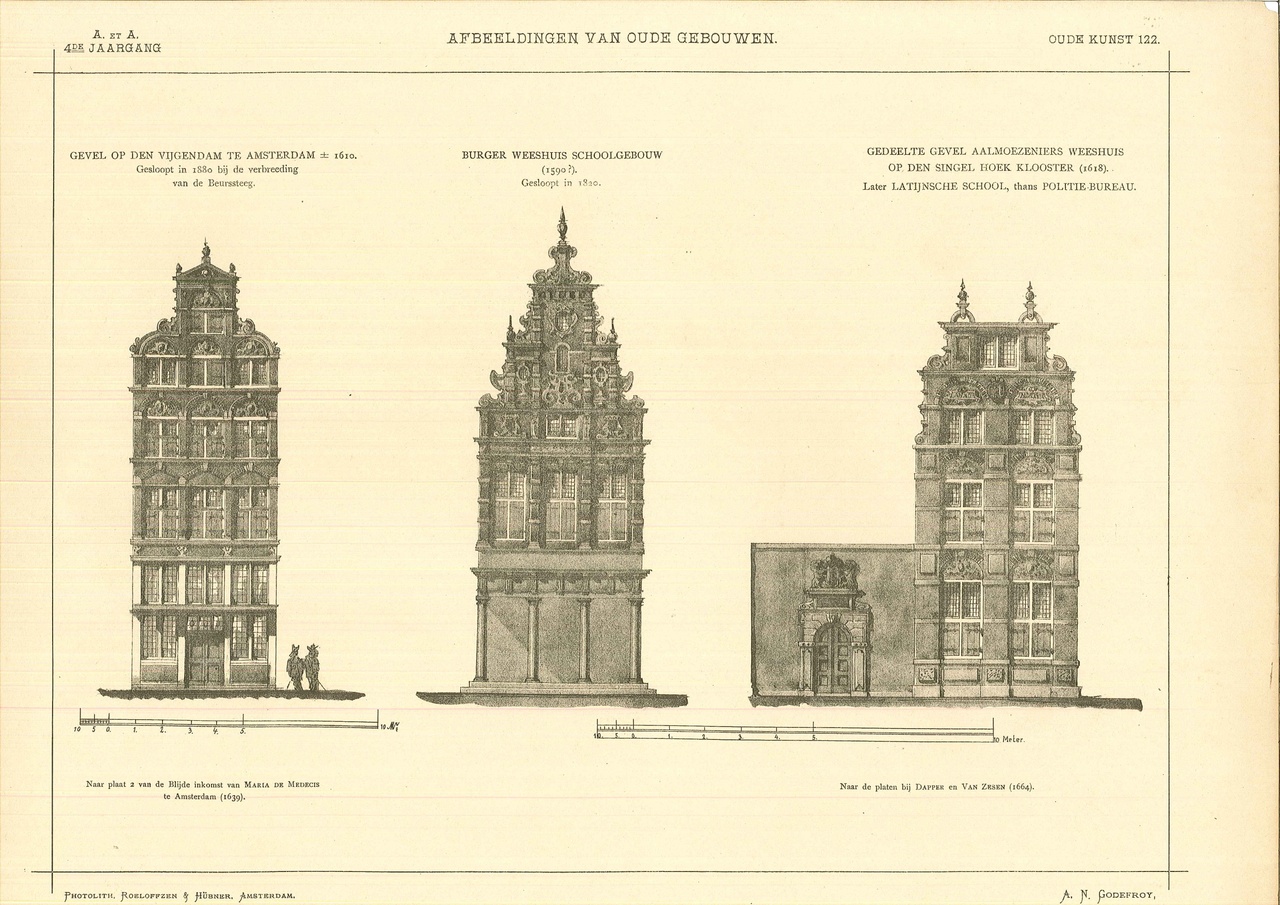 De platen tonen afbeeldingen van oude gebouwen, o.a. een gevel op de Nieuwendijk te Amsterdam, een gevel te Dordrecht, een gevel op de Vijgendam te Amsterdam, Burger Weeshuis school Amsterdam, gedeelte Aalmoezeniers Weeshuis Amsterdam.
