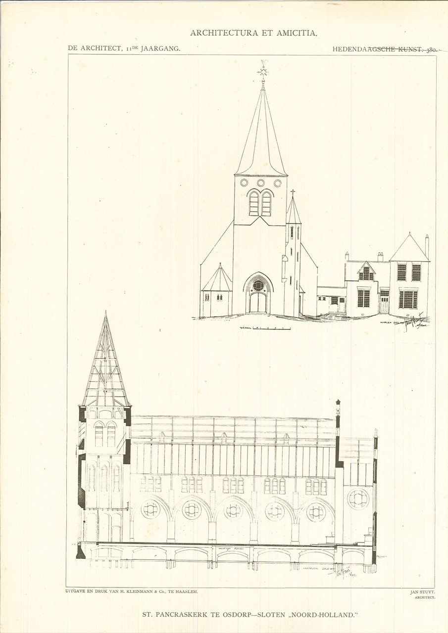 Twee platen uit "De Architect" met daarop een afbeelding en ontwerptekeningen voor de Sint Pancraskerk te Osdorp-Sloten door architect Jan Stuyt.