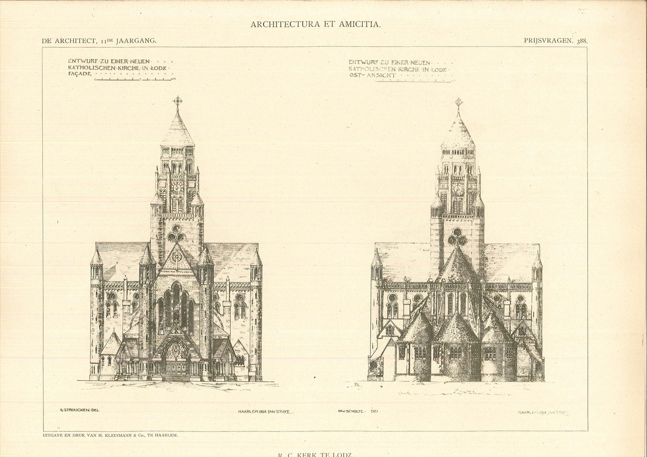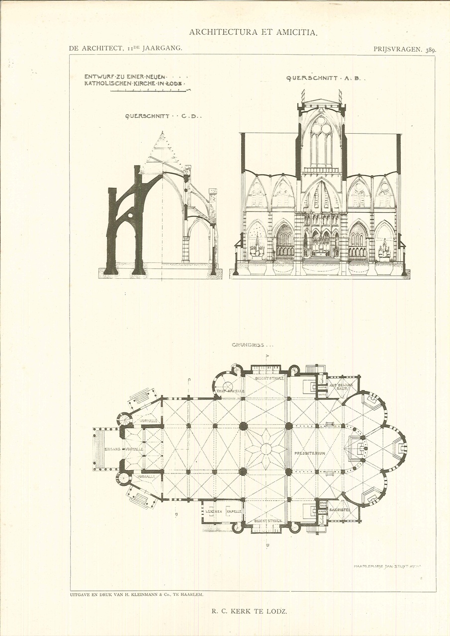 Drie platen uit "De Architect" met daarop een afbeelding en ontwerptekeningen voor de R.C Kerk te Lodz door architect Jan Stuyt.