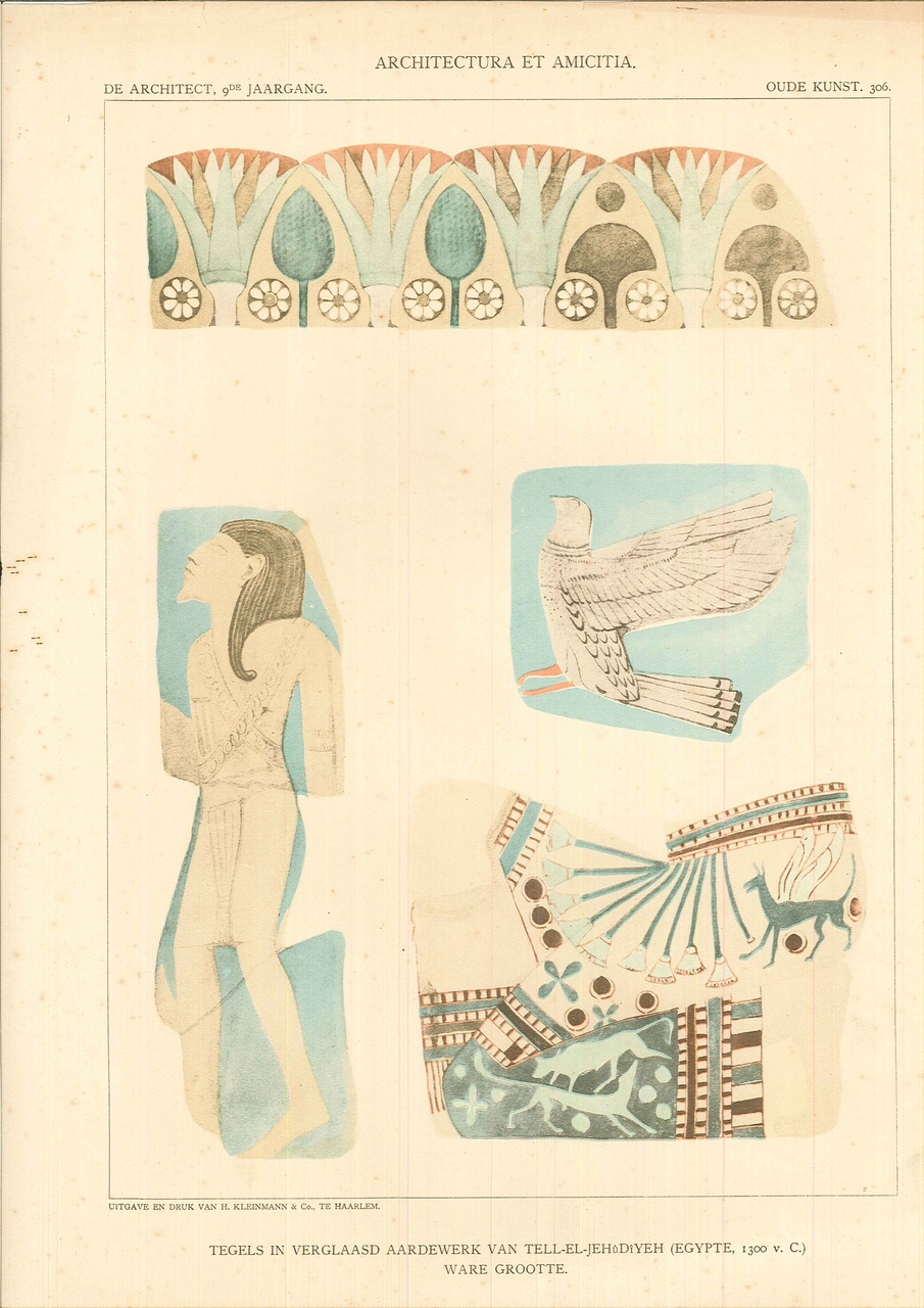 Enkele gekleurde afbeeldingen van tegels in verglaasd aardewerk van Tell-Ell-Jehdiyeh (Egypte, 1300 v.C.)