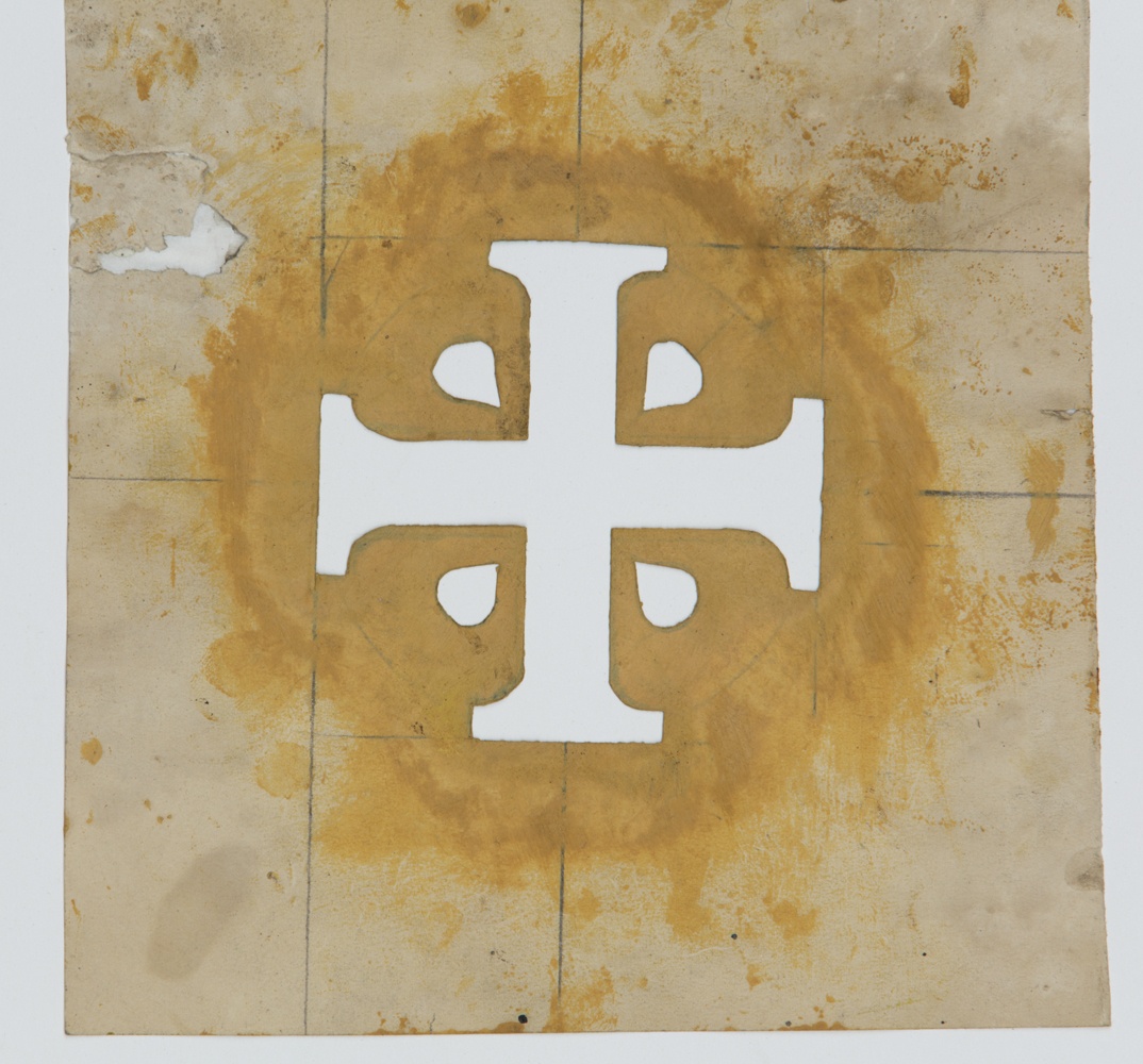 In het sjabloon is een vierkante kruisvorm uitgesneden met tussen de armen van het kruis druppelvormen. Gebruikt met gele verf.