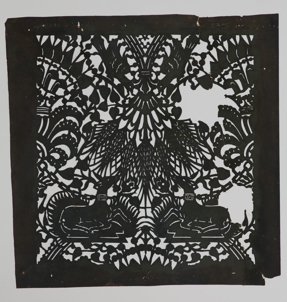 Op het sjabloon is een symmetrisch patroon aangebracht, floraal, met twee liggende geiten of herten en centraal een hangende bos korenaren. Het sjabloon is gebruikt met groene verf.