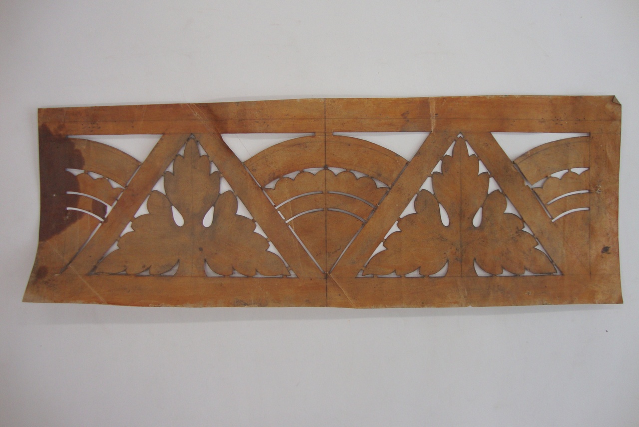 Sjabloon voor bandversiering met repeterend motief van eikenbladen, driehoeken en kwart cirkels