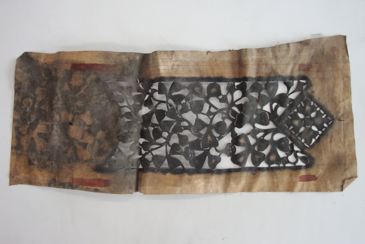 Het sjabloon is gebruikt met zwarte verf en is voorzien van hulplijnen en aanwijzingen in potlood. Bovenaan staat geschreven: "Banden Lutterade" Met rode verf is een aanzet tot een rand gegeven. Onder een niet verder uitgewerkte cirkel.