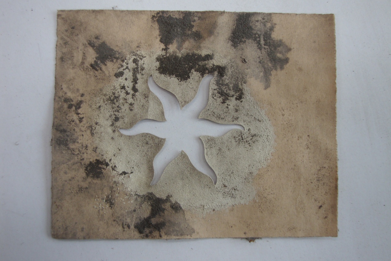 De in het sjabloon uitgesneden ster heeft zes kronkelende stralen. Gebruikt met geel/beige verf.