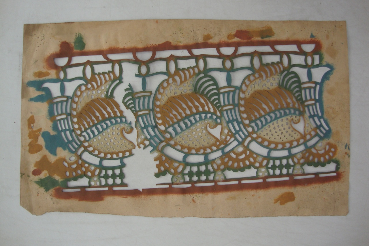 Het sjabloon is gebruikt met verf in de kleuren rood, oker groen en blauw. Aan de zijkant zijn deze kleuren uitgeprobeerd.