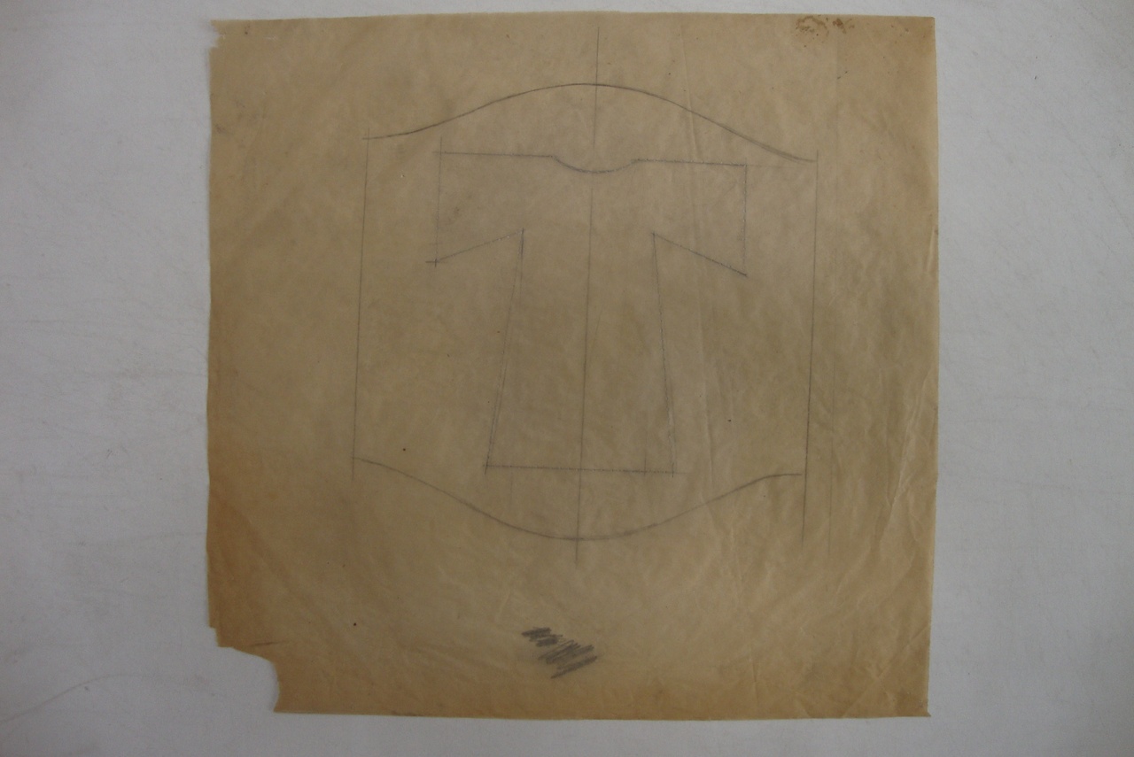 De doorstuiftekening laat het ontwerp voor een kazuifel zien. Op de tekening ook enkele hulpijnen met potlood.
