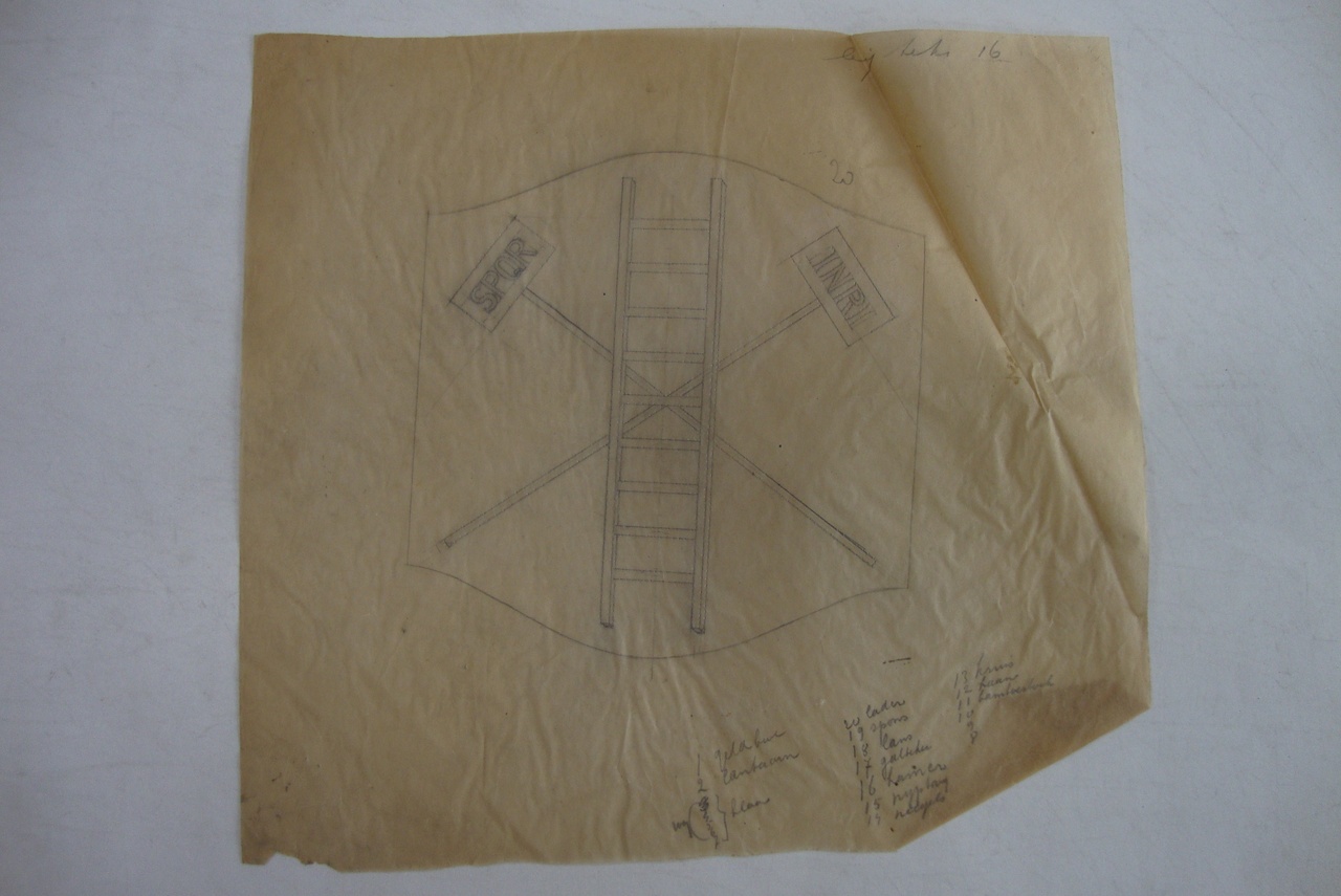 rechts beneden: geschreven: 1 geldbuil 2 lantaarn 3, 4 , 5, 6, 7 weg klaar; 20 lader (ladder?) 19 spons 18 lans 17 galbeker 16 hamer 15 nijptang 14 nagels 13 kruis 12 haan 11 bamboe stok 10 9 8 / potlood