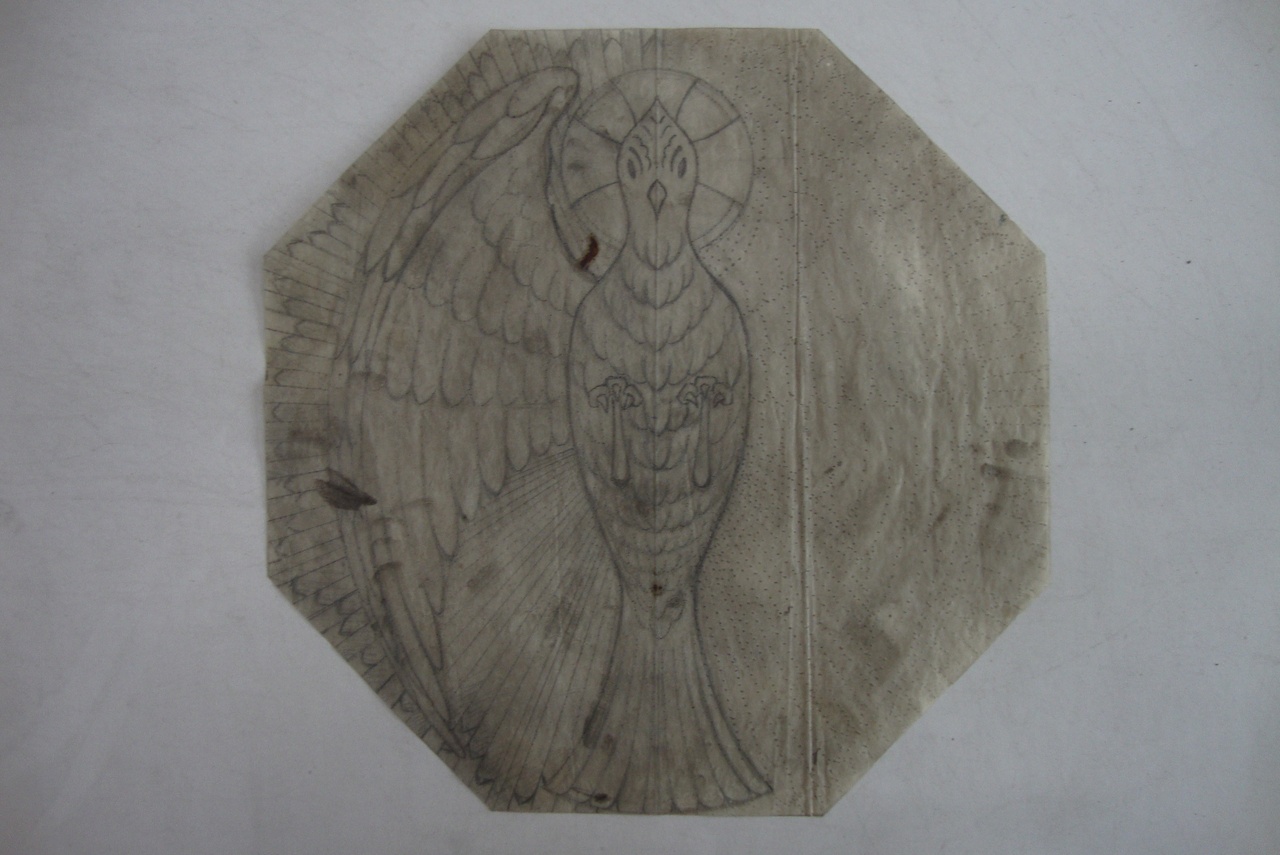 Achthoekige doorstuiftekening met voorstelling van duif met nimbus en stralen.