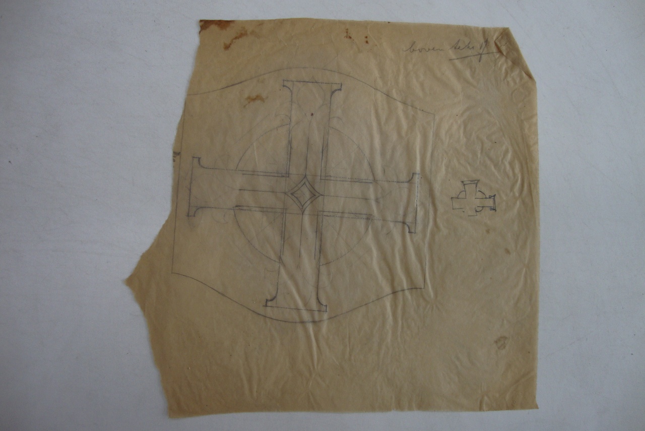 Op het ontwerp staat een kruis afgebeeld met gelijke armen. De uiteinden van de kruisarmen zijn iets breder dan de rest. In het midden rechts staat een kleiner en onvolledig schetsje van een kruis.