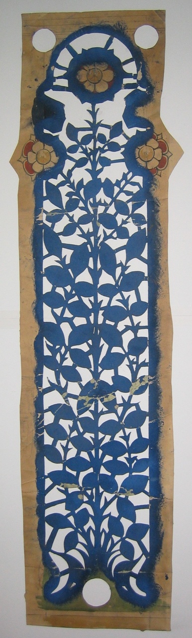 De bladranken zijn uitgesneden, de bloemmotieven (3 stuks) niet. Boven zijn 2 en onder 1 cirkelvorm uitgesneden.